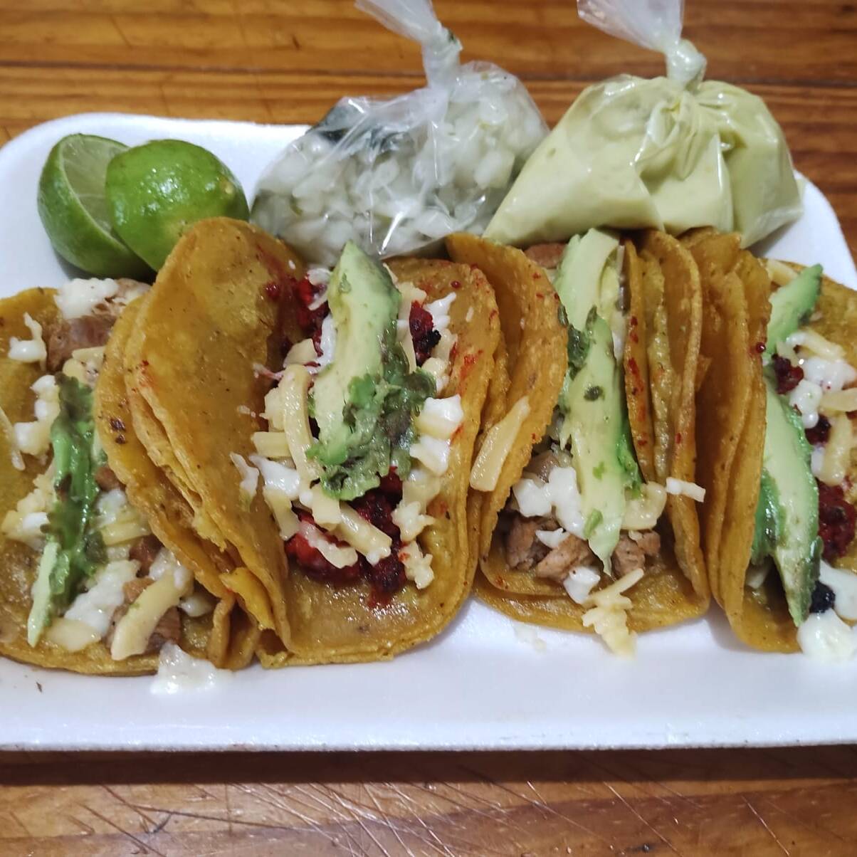 4 Tacos en tortilla de harina hecha al momento, rellenos de carne de trompo, queso derretido y rebanadas de aguacate. Salsa de la casa, limones, cilantro y cebolla.