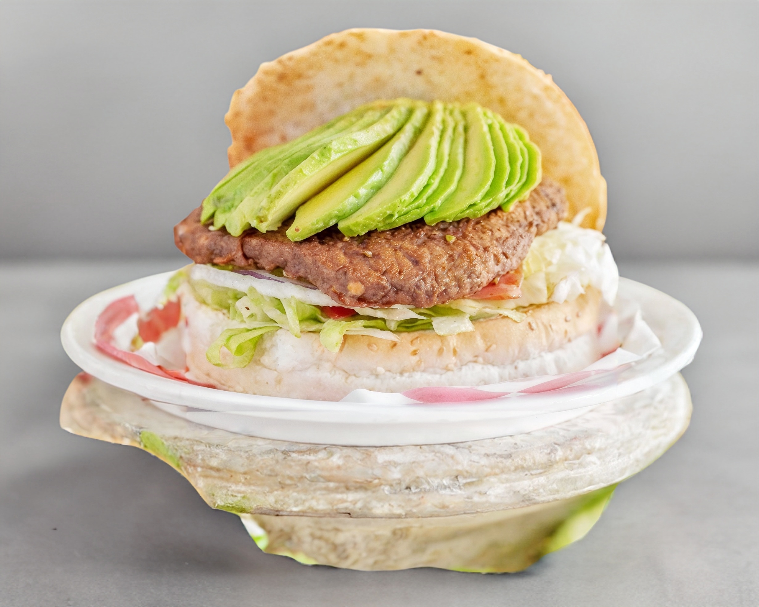 Carne de res , Mucho aguacate,queso amarillo, lechuga, tomate cebolla morada, pepinillos y aderezo