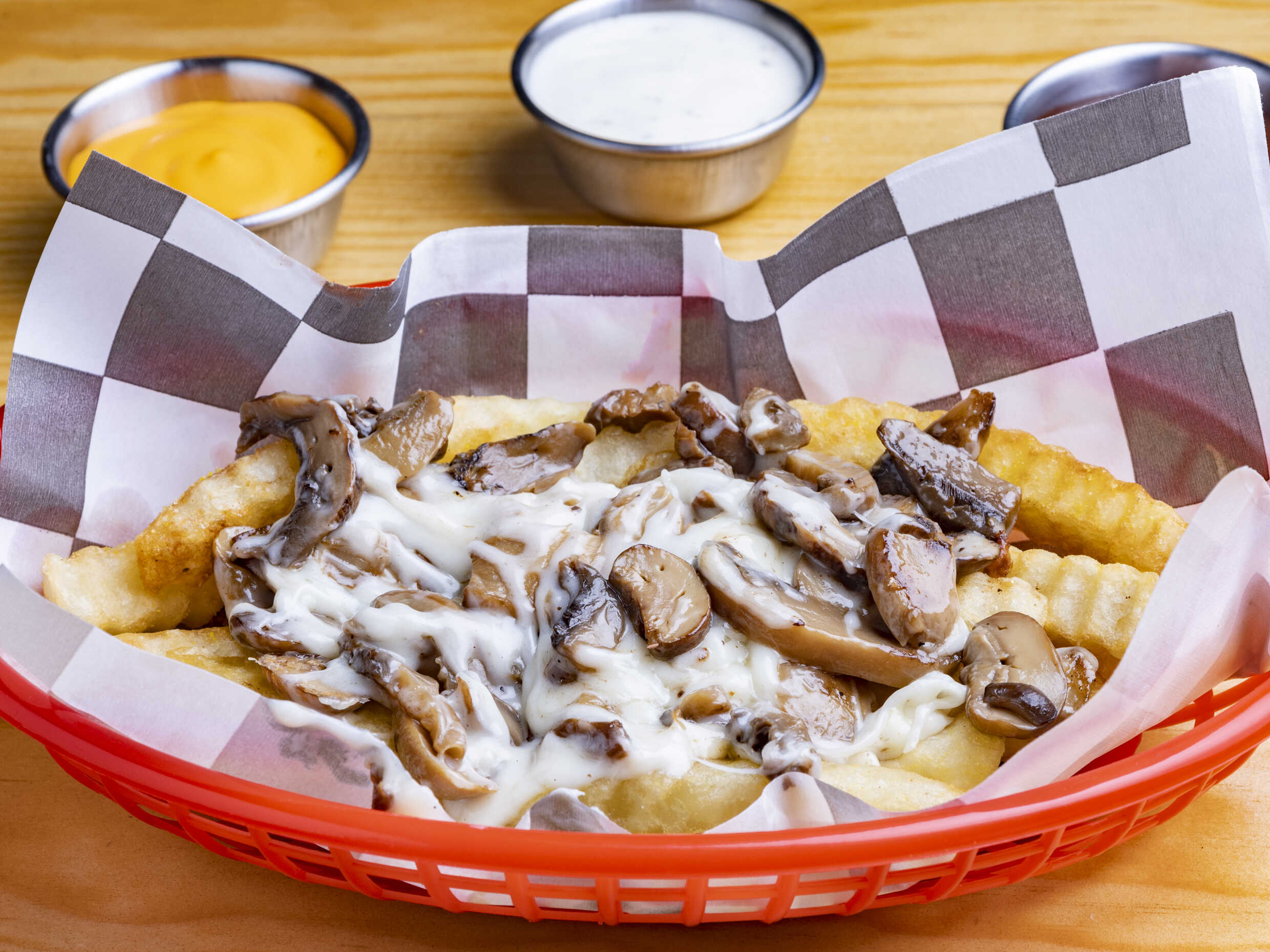Orden de papas fritas clásicas con champiñones y queso fundido + un topping
