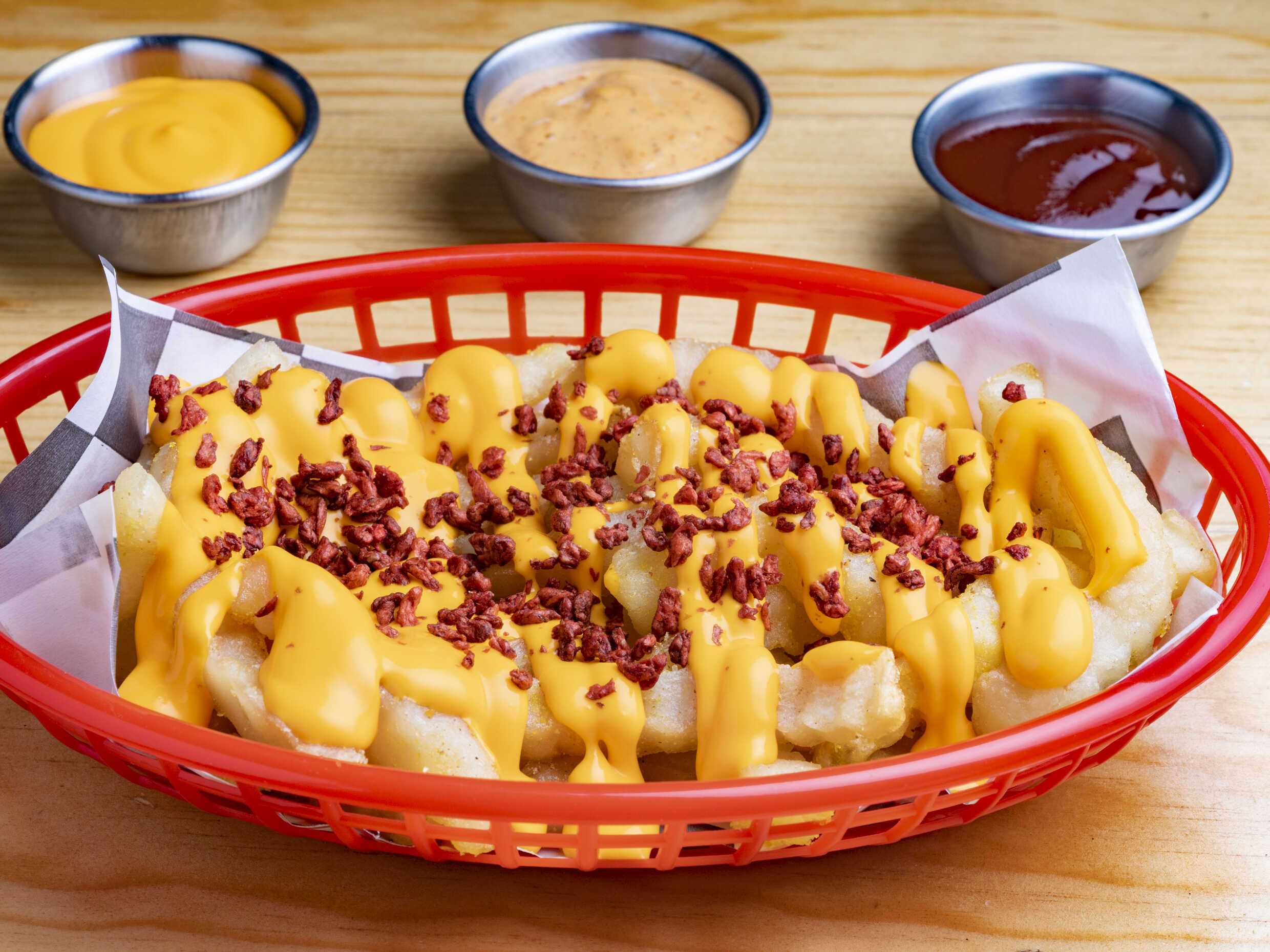 Orden de papas fritas con queso amarillo, ranch salsa toxica y bits de tocino