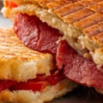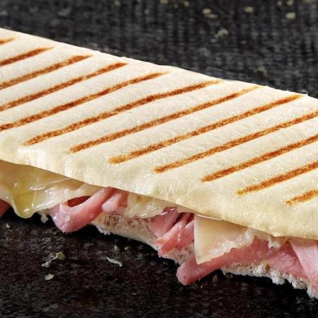 Panini artesanal con jamón y queso derretido.