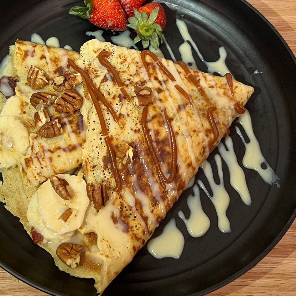Crepas dulces con 2 ingredientes a elegir: Philadelphia dulce, chocolate, cajeta, lechera, Lotus, crema de cacahuate, frutos rojos, philadelphia, maple, Nutella o plátano.