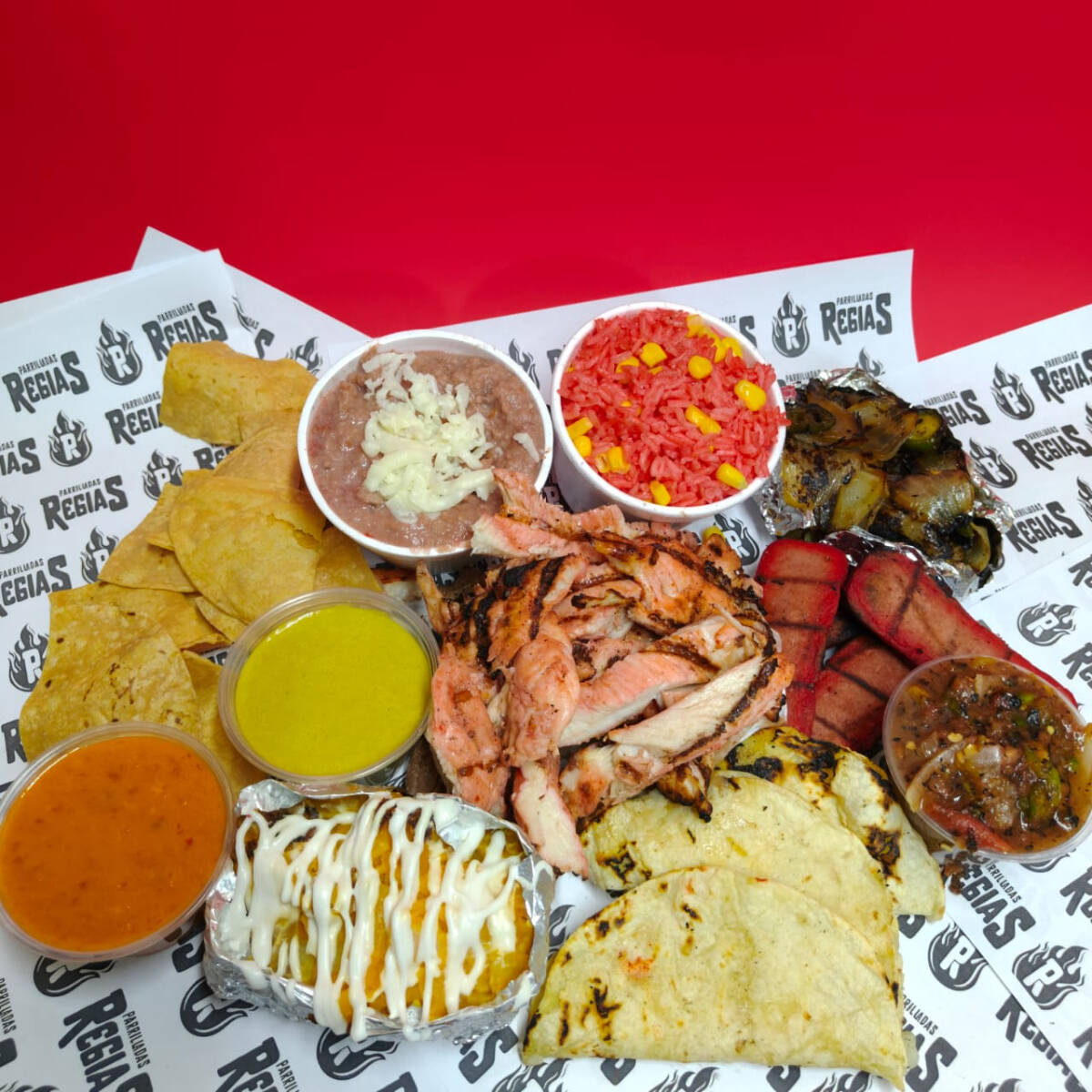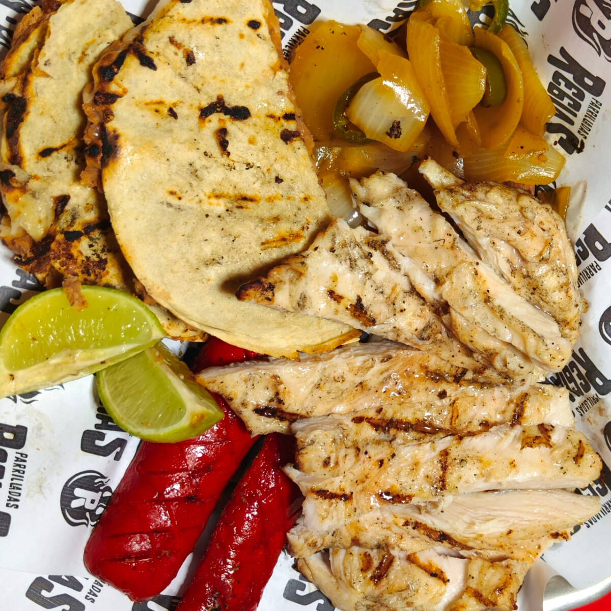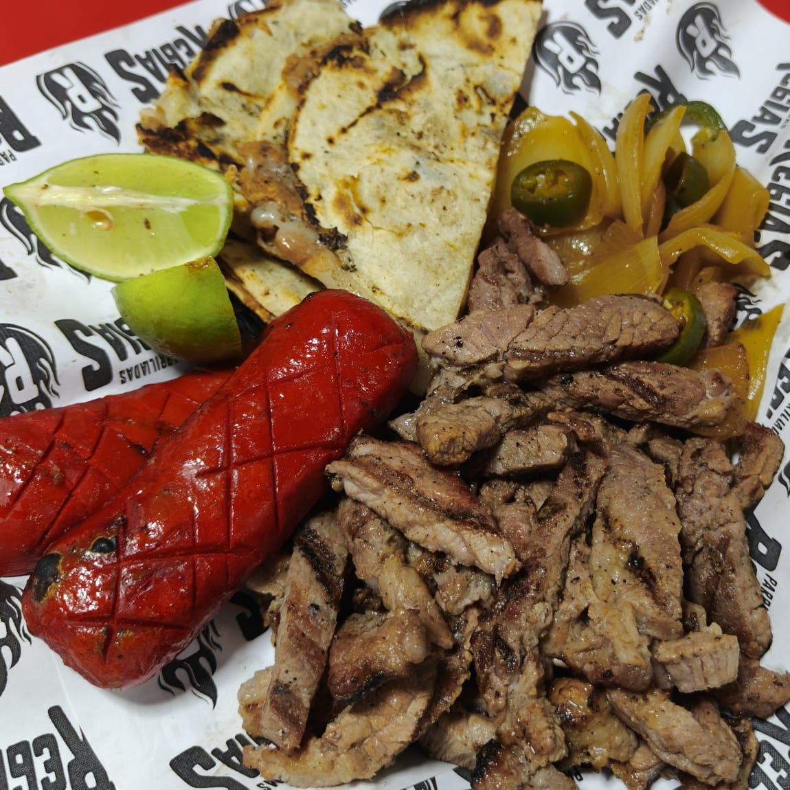 DELICIOSA PECHUGA PARRILLADA, SALCHICHAS, EMPALME DE FRIJOL Y QUESO, CEBOLLA ASADA, SALSA, LIMON Y TORTILLAS