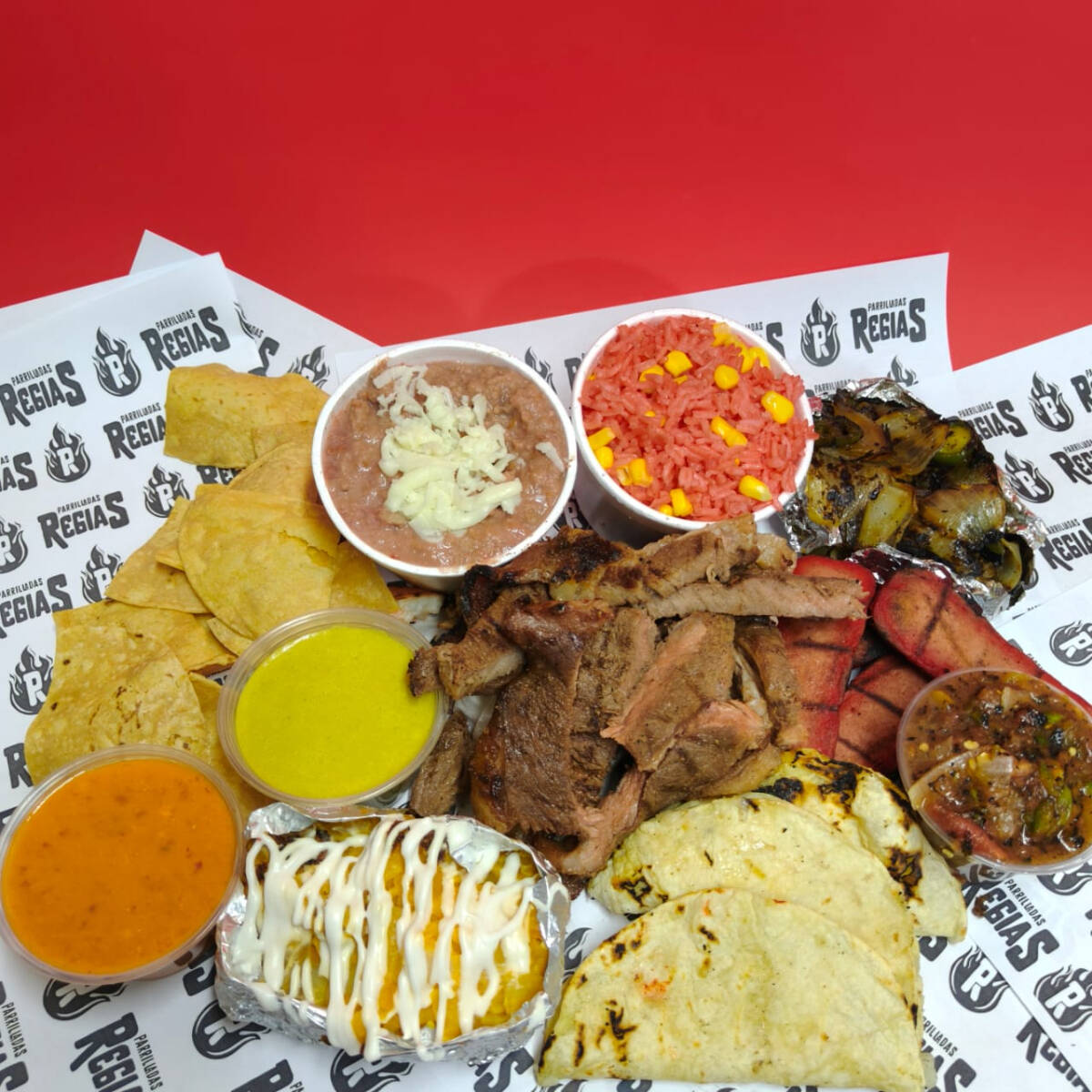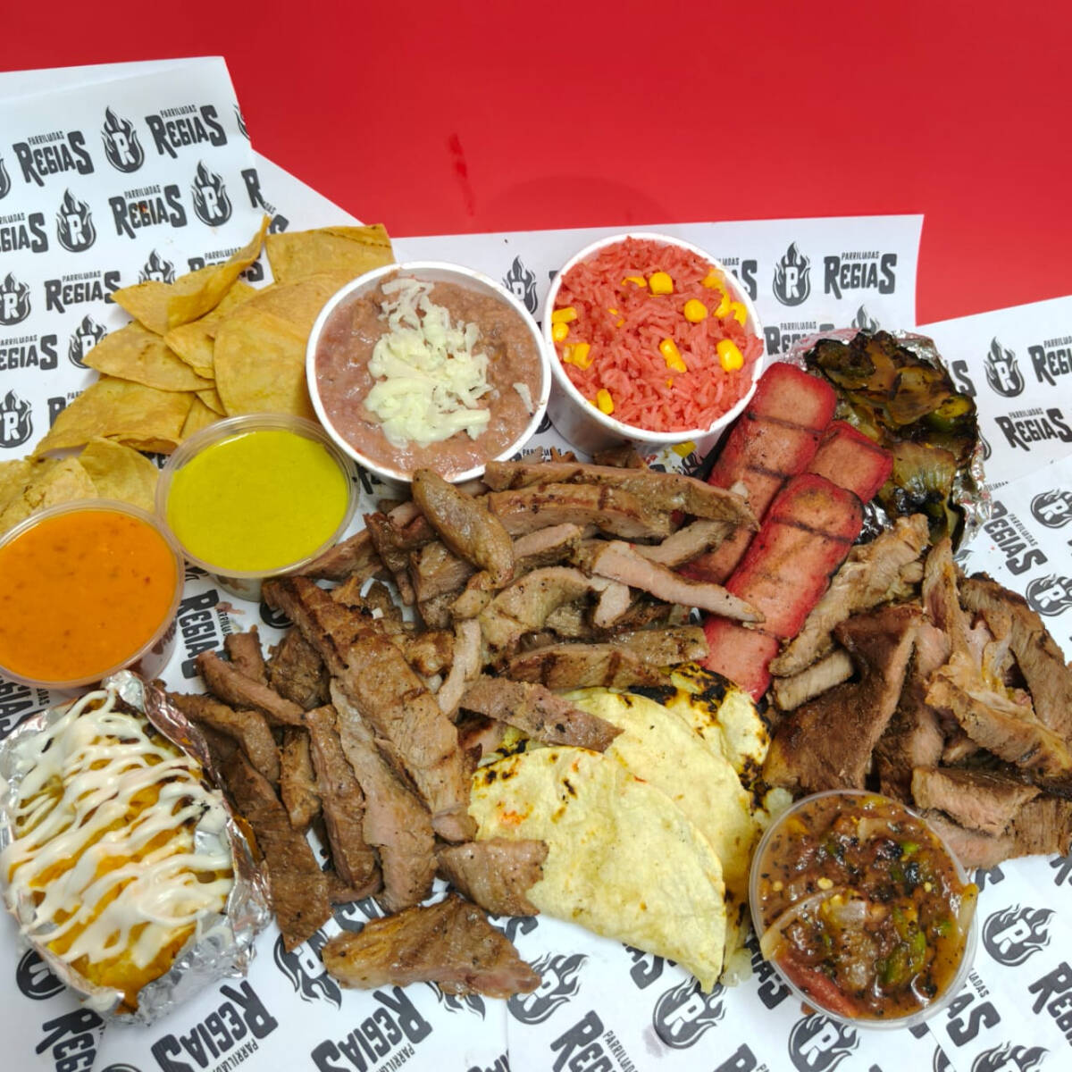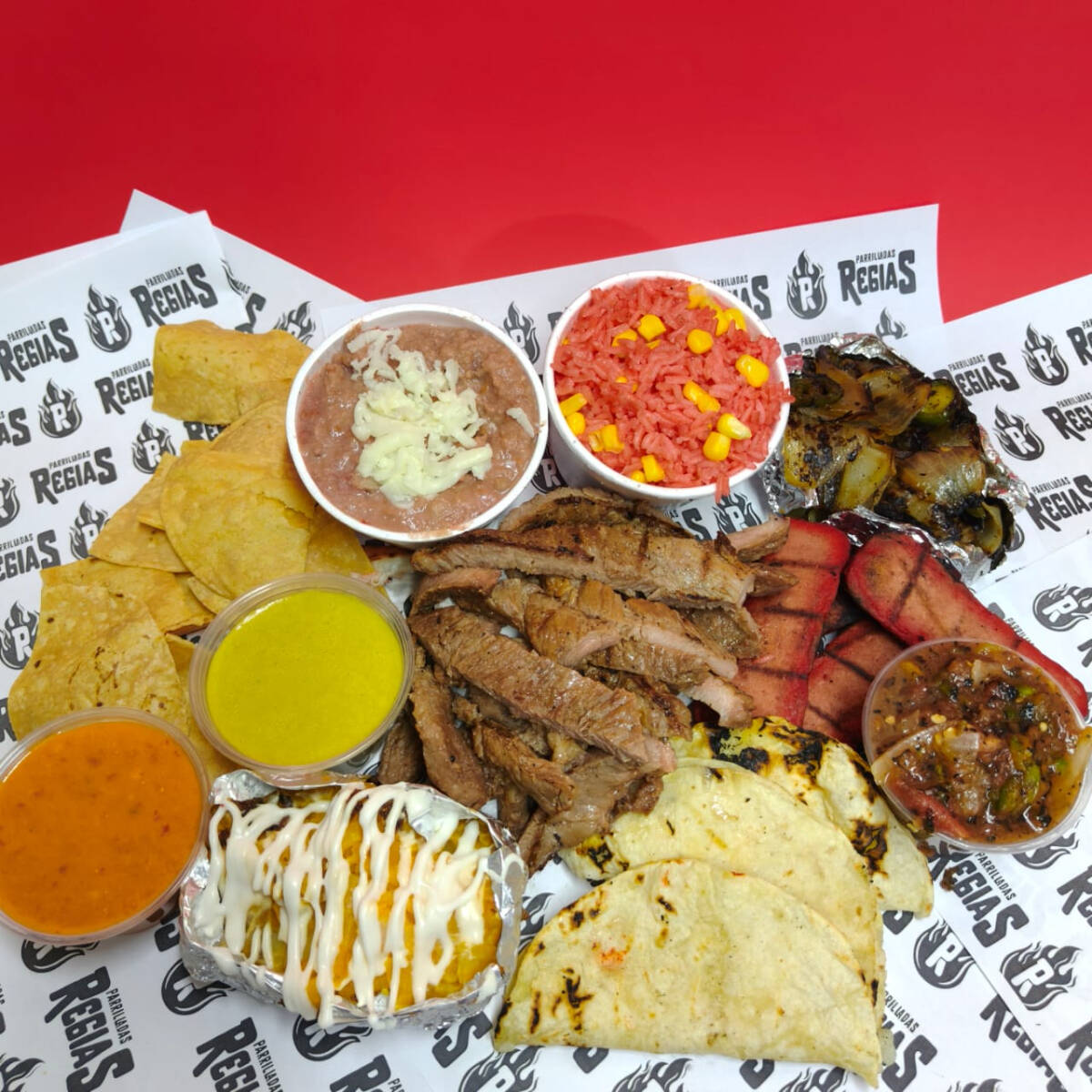 500GR DE TOP SIRLOIN, QUESADILLAS, SALCHICHAS, CEBOLLA ASADA CON CHILE, PAPA ASADA, FRIJOLES, ARROZ, TOTOPOS, TORTILLAS, LIMONES Y SALSAS. (GRAMOS EN CRUDO)