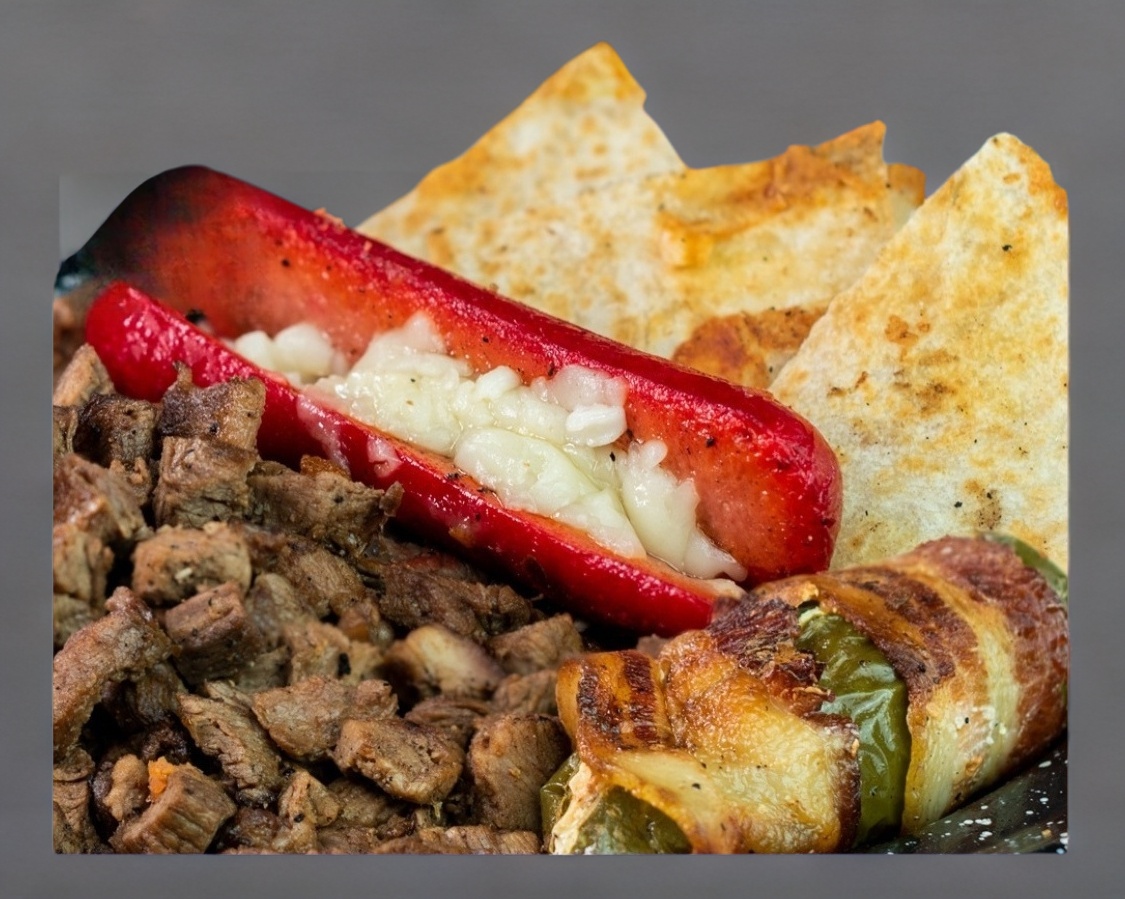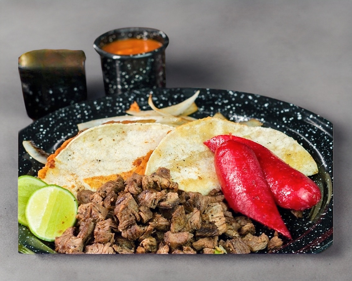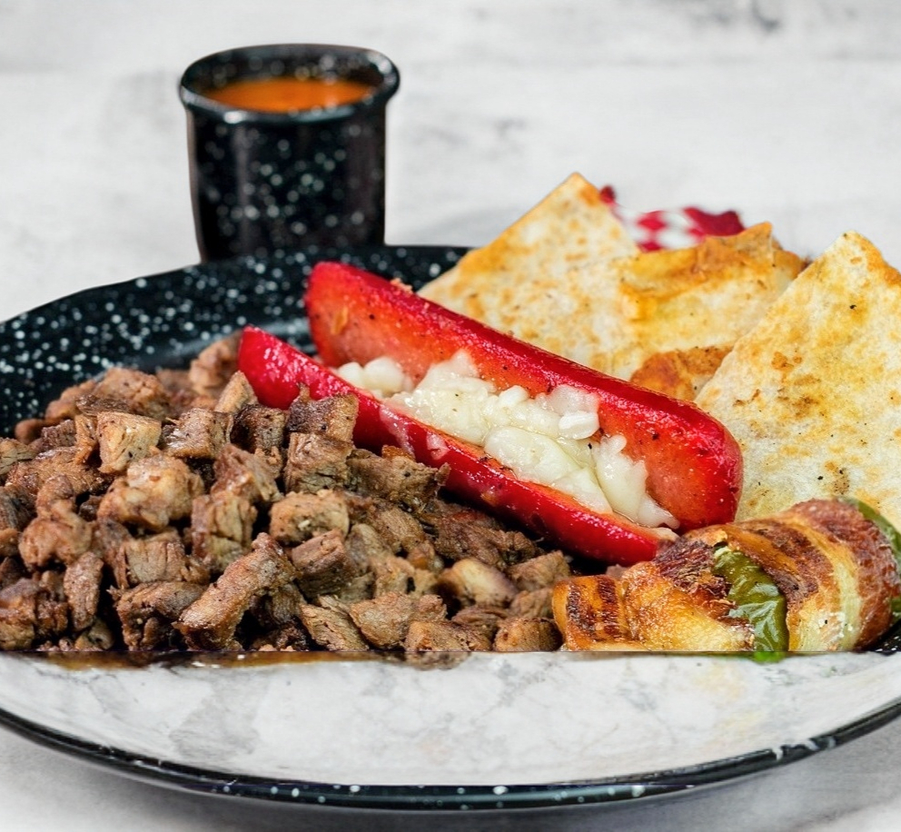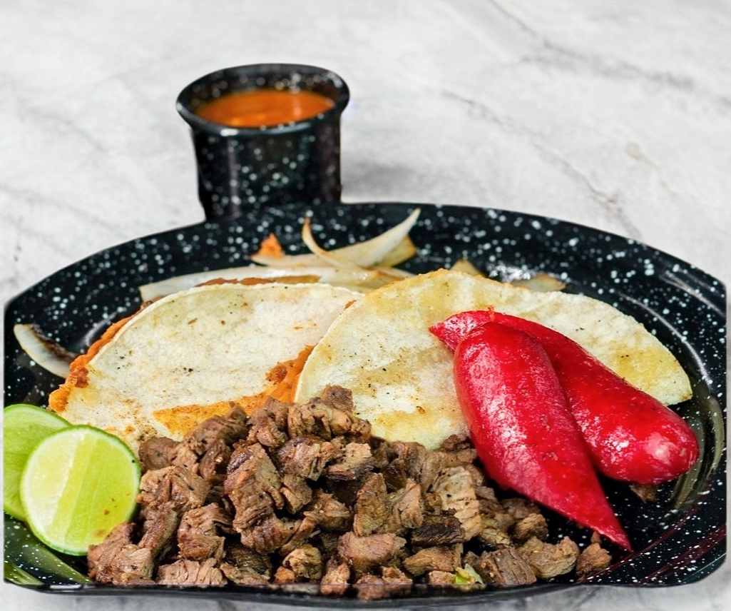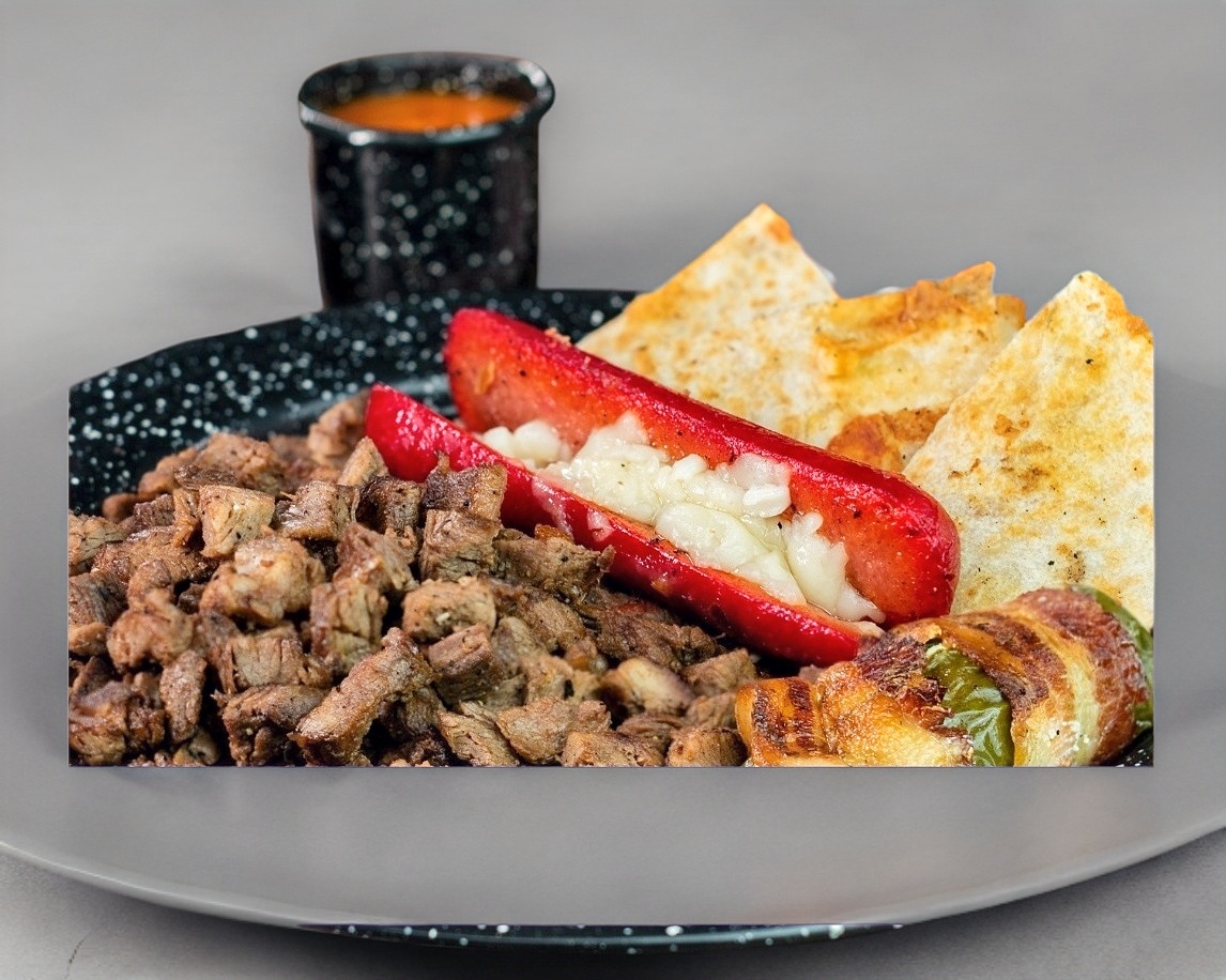 Nuestro Tradicional Sirloin (200gr) Media Salchicha y 2 Quesadillas Estilo Sirloin Acompañado de Cebolla Asada.
