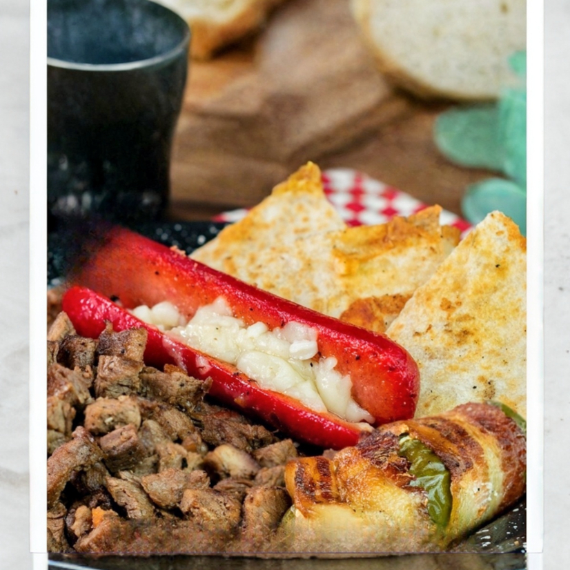 Salchicha Rellena de Queso Envuelta en Tocino con nuestro Sirloin.