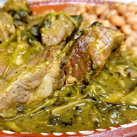 Delicioso chicharrón de cachete guisado en salsa verde con tortillas
