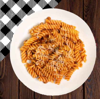 Pasta con salsa de tomate con especias italianas y carne de res molida.
