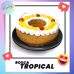 Pastel de vainilla humedecido con almíbar de durazno y cubierto con betún de queso crema, adornado con trocitos de frutas tropicales.