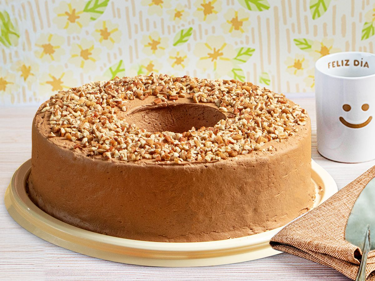 Pan de chocolate en forma de rosca, cubierto de nuestro tradicional betún alemán, decorado con nuez picada.
