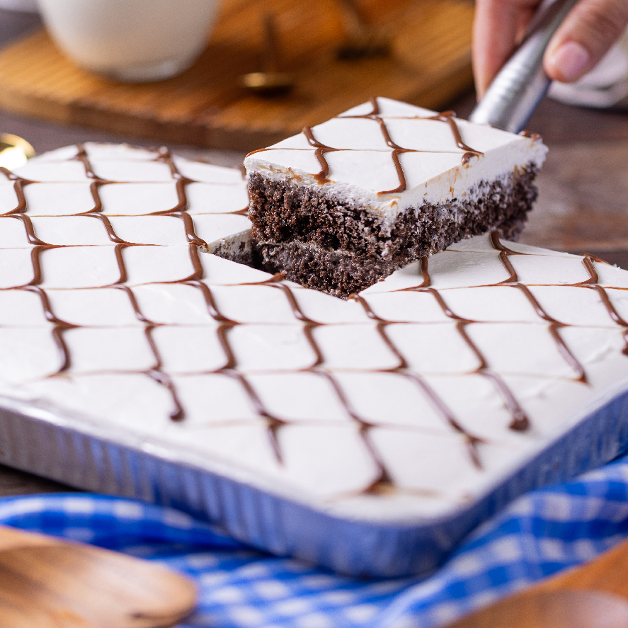 Pan de chocolate ligeramente húmedecido con esencia de vainilla, con betún de crema y rallado con chocolate.