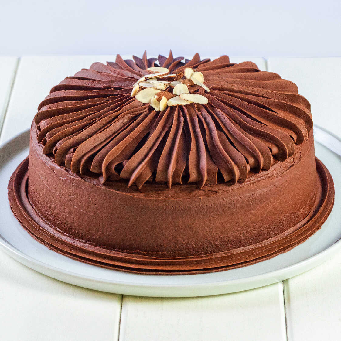 Pastel de 3 panes sabor chocolate, almendra y café, relleno de mermelada de fresa entre capa y capa decorado con chocolate Turín.