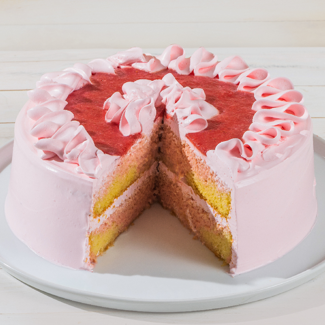 Pan de vainilla decorado y relleno de betún con yogurt de fresa, decorado con una salsa de fresa