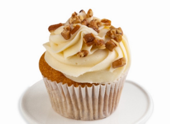 Pan de zanahoria con nuez, }decorado con betún de queso y nuez
