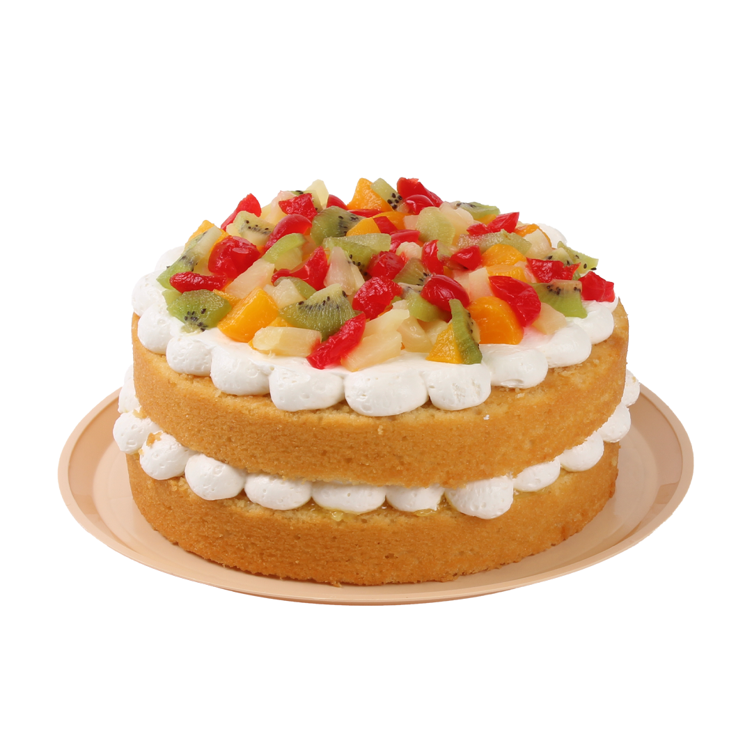 Pastel de vainilla con betún de queso, mermelada de piña, piña, kiwi, durazno y cerezas.