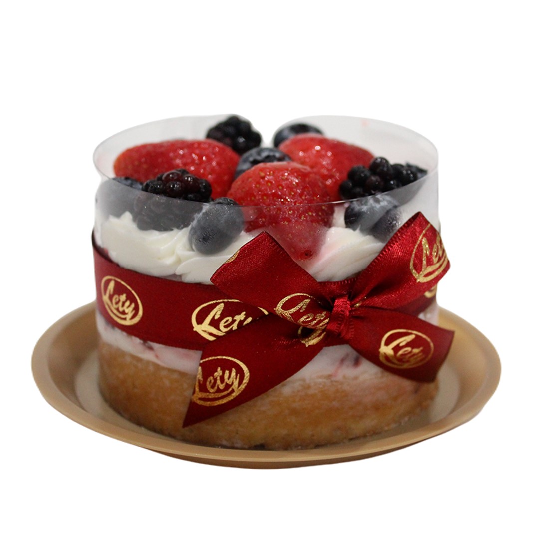 Pan vainilla con bluberry ligeramente humectado con jarabe de limón, relleno con mermelada de frutos rojos y betún de tentación, decorado con mermelada de frutos rojos, betún tentación, blueberry, zarzamoras y fresa.
