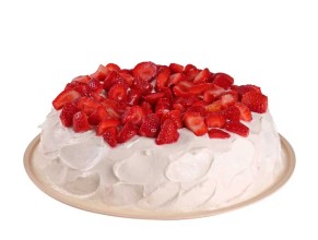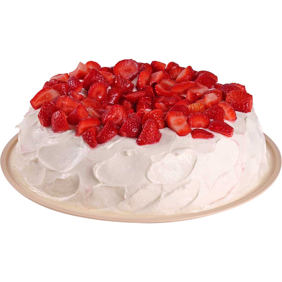 Pan sabor vainilla, relleno con crema de yogurt y mermelada de fresa, cubierto con la misma crema , decorado con salsa de fresa y fresas.