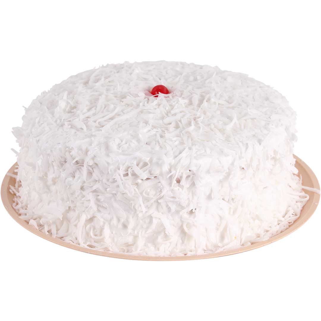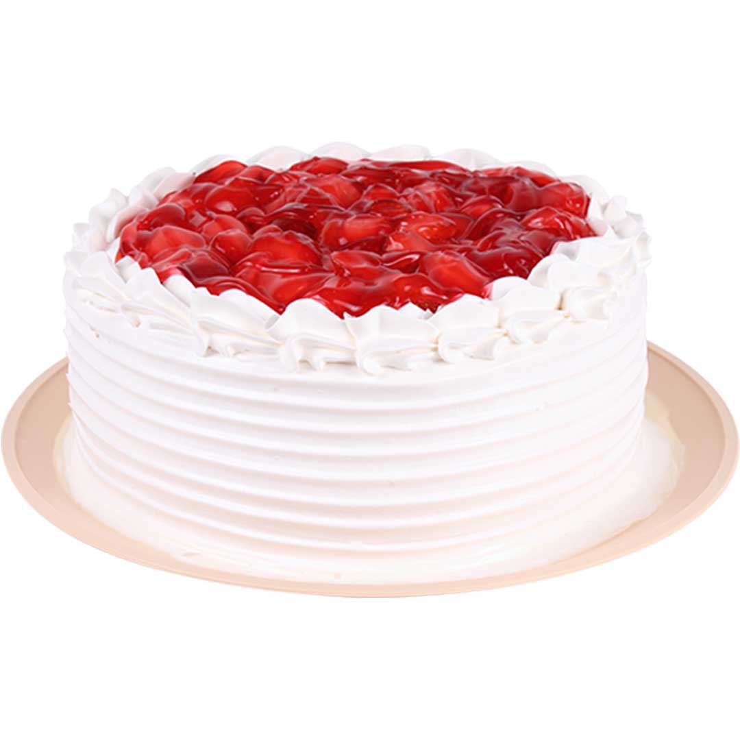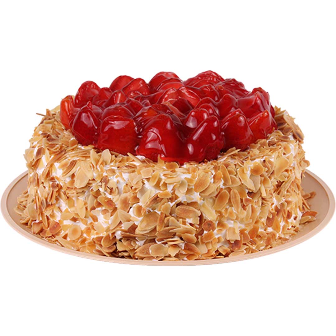 Pan sabor vainilla con relleno de mermelada de fresa y crema de vainilla, cubierto con crema de vainilla, decorado con almendra, fresa y glasé de fresa.