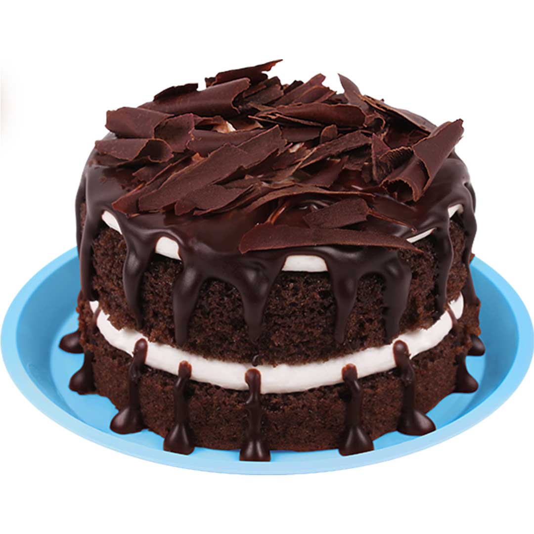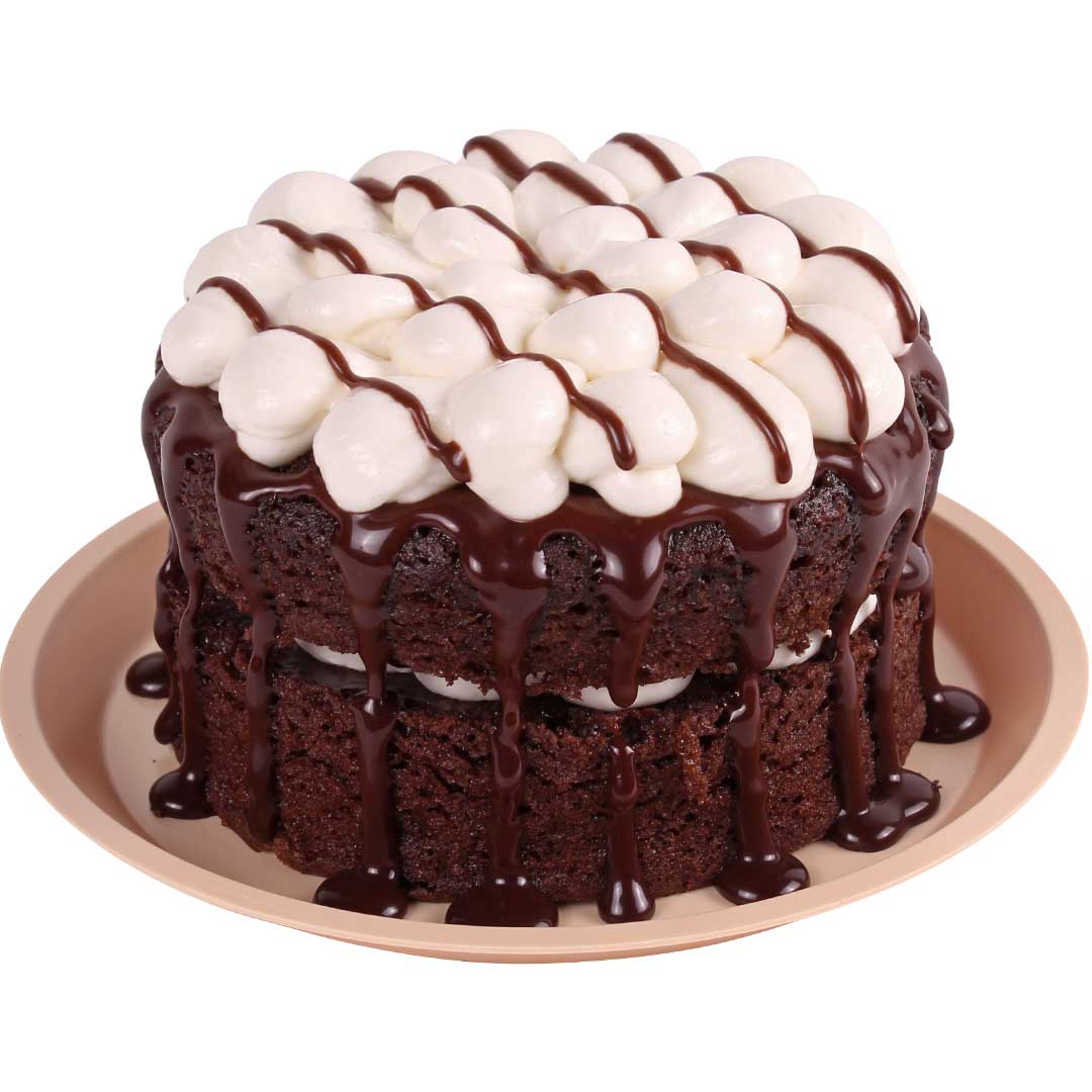 Pan sabor chocolate, relleno y cubierto con ganashe de chocolate y betún de queso.