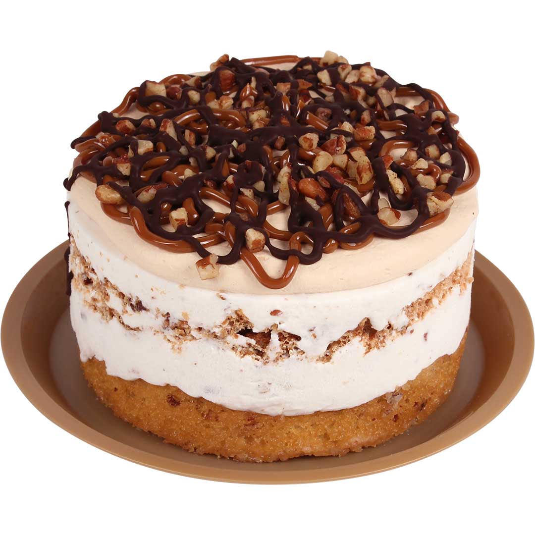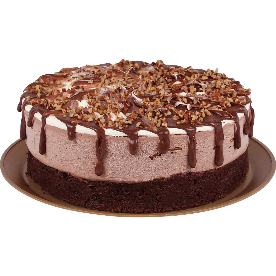 Nieve y pan nuez, mostachón, cubierta de crema, cajeta, nuez y cobertura sabor chocolate.