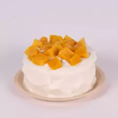 Base de galleta de vainilla con nieve de sabor mango, relleno de salsa de mango y cuadritos mango, decorado con crema vainilla salsa de mango y mango en cuadritos