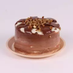 Pan vainilla con nieve de chocolate, relleno con ganache y bolitas Crunch, decorado con cobertura de Crunch Rocks.