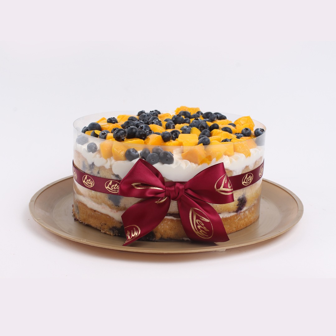 Pan vainilla con blueberry ligeramente humectado con jarabe de limón, relleno con mermelada de frutos rojos y betún de queso, decorado con betún de queso, mango y blueberry.