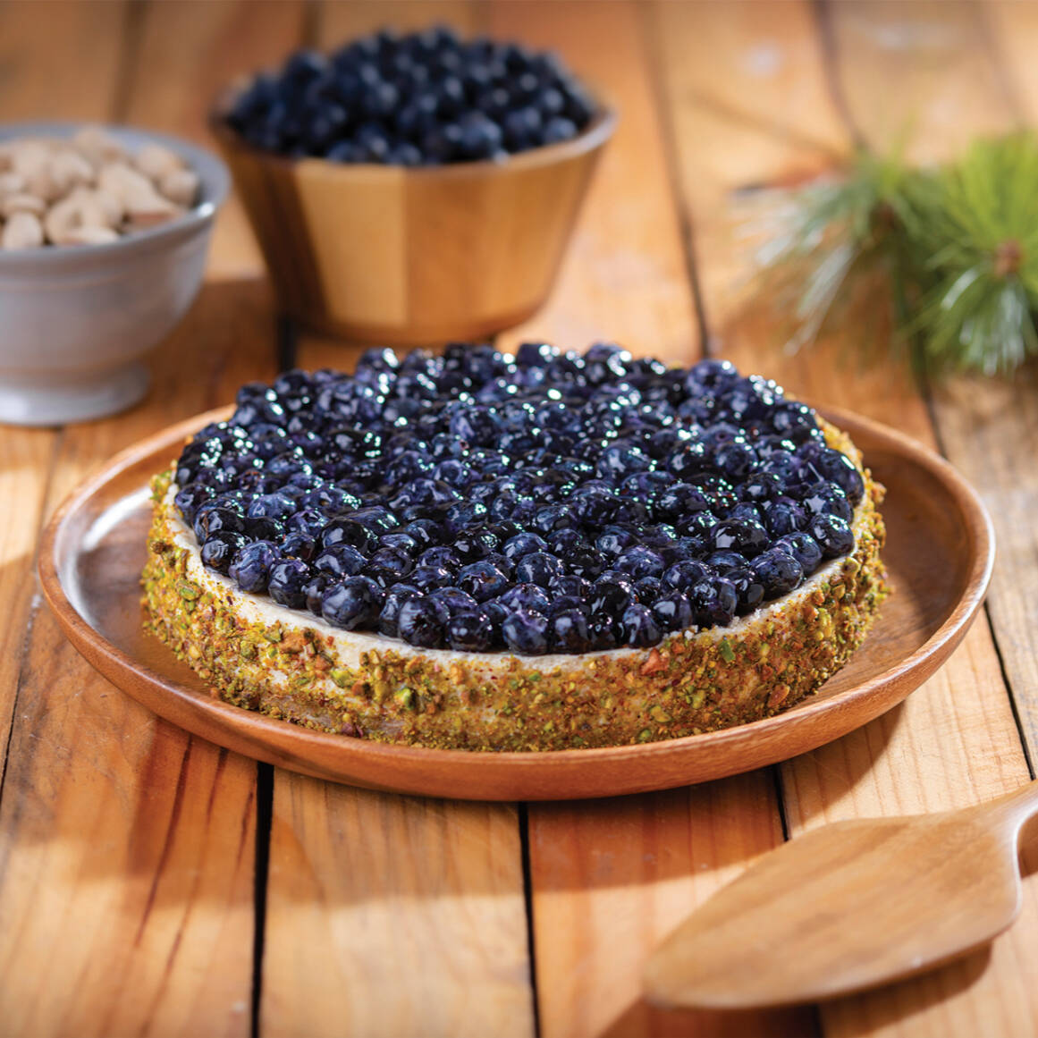 Pay de queso crema sobre una base de galleta, cubierto de jugosos blueberries frescos. decorado en la orilla con pistaches que agrega un sabor ligeramente salado y el crunch que complementa a la perfección la dulzura de los blueberries y la suavidad del queso crema. rinde de 12 a 14 rebanadas.