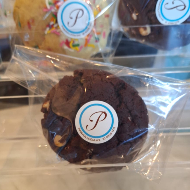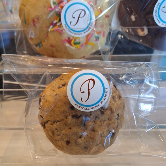 Galleta horneada de sabor vainilla. con una textura suave por dentro y ligeramente crujiente por fuera, y con relleno de chispas de chocolate para un contraste dulce y cremoso.
