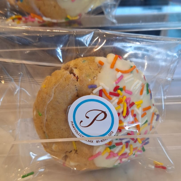 Galleta horneada sabor vainilla. decorada con glaseado y sprinkles de colores. con una textura suave por dentro y ligeramente crujiente por fuera.