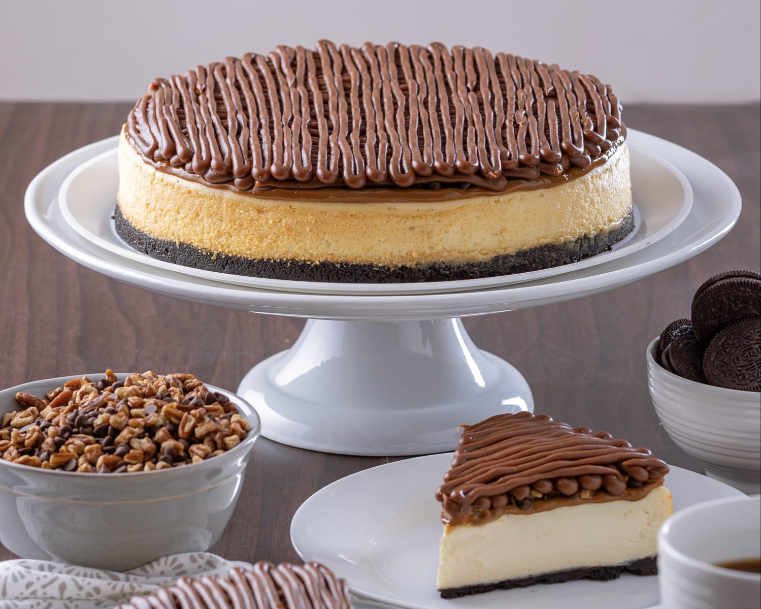 Riquísimo pay de queso con base de galleta Oreo, decorado con betún de chocolate sobre nuez y chispas de chocolate. Grande (rinde de 15 a 18 rebanadas).