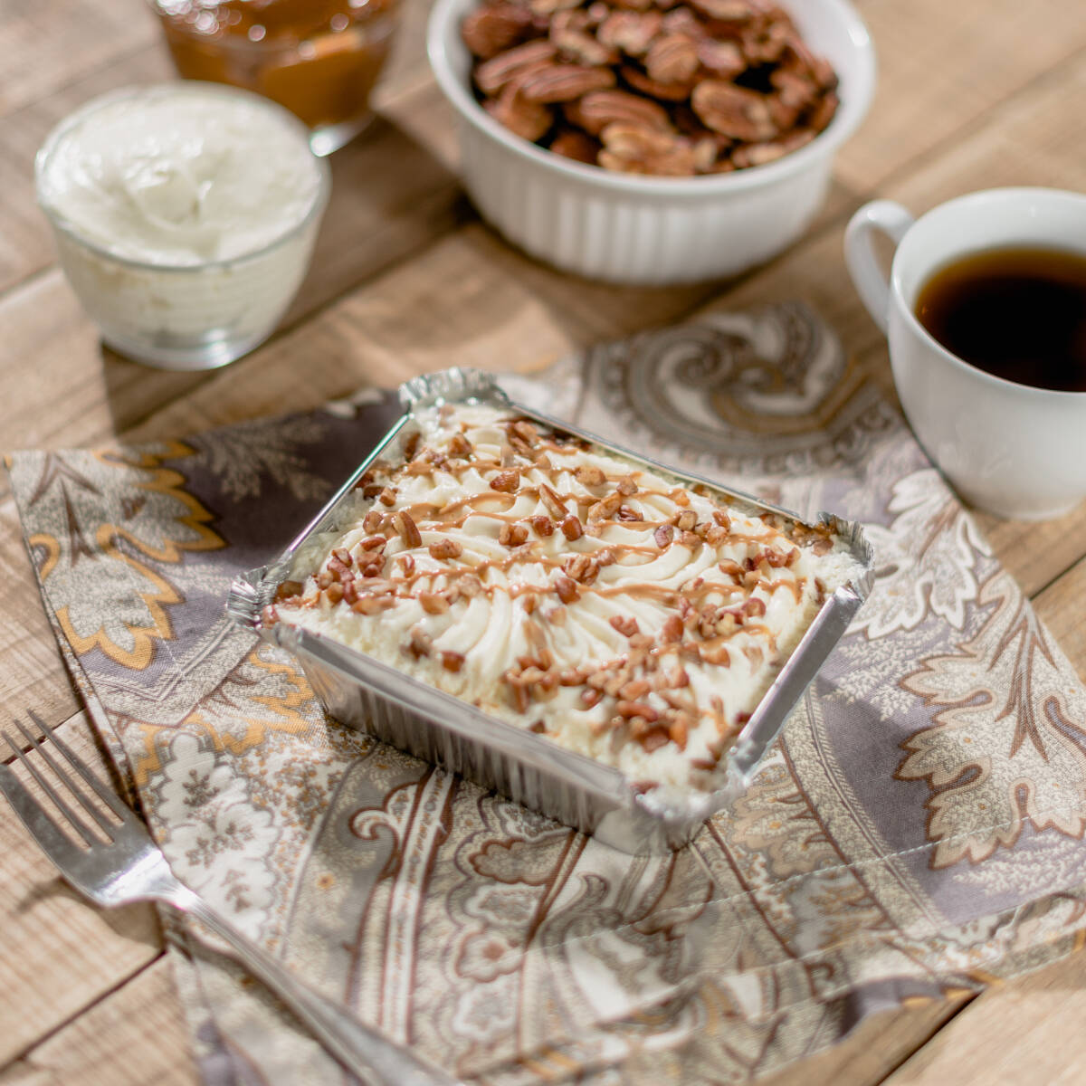 Pan vainilla humedecido en jarabe de tres leches, betún cremoso de queso crema, decorado con cajeta y nuez.