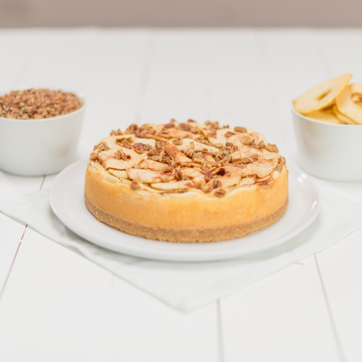 Pay de queso crema light horneado sobre una base de galleta molida, cubierto con finas rebanadas de manzana, trocitos de nuez y un toque de canela. Endulzado con Splenda.