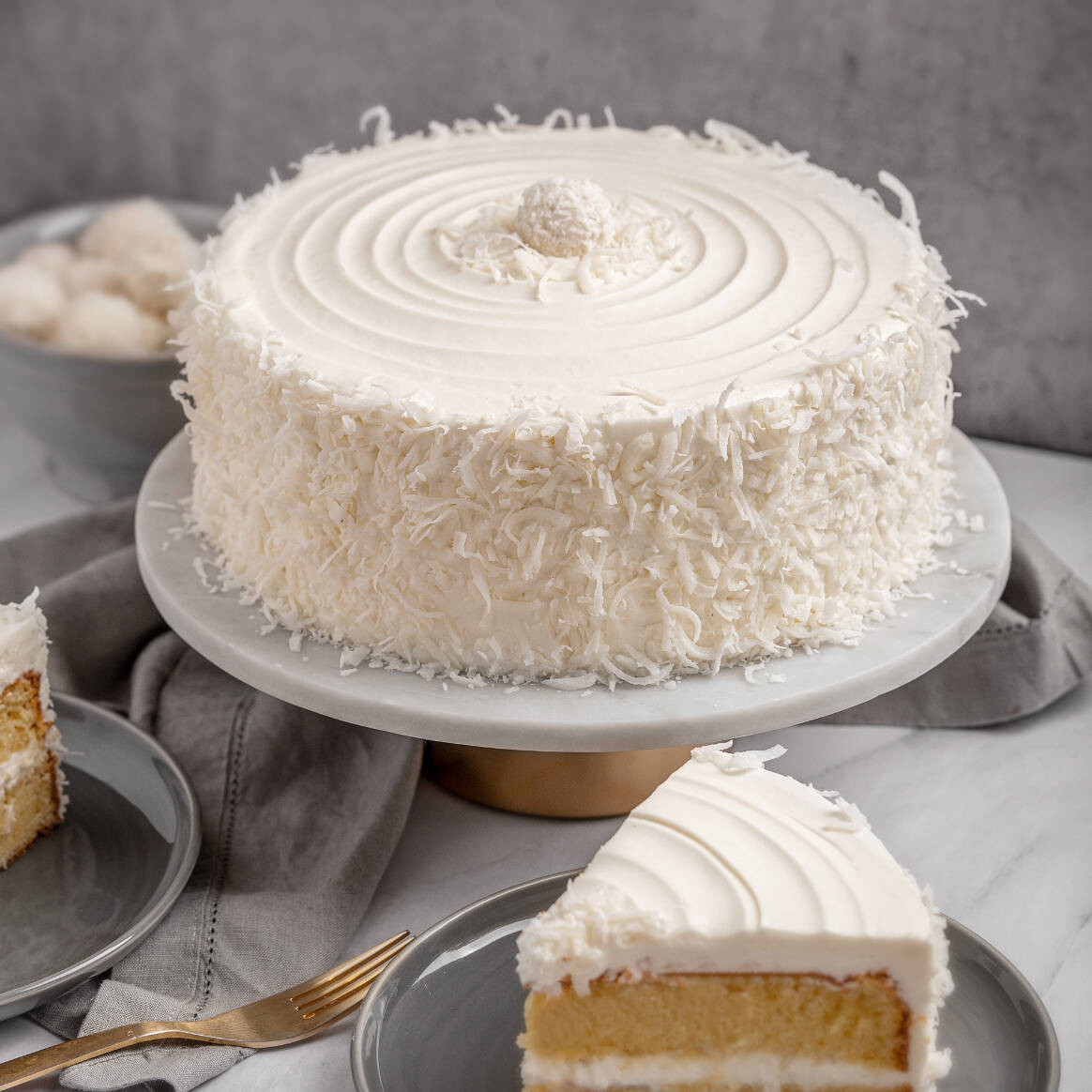 Suave pan vainilla sabor a coco. Cubierto y relleno con cremoso betún de queso y coco natural rallado. Como toque final: un rico Raffaello Ferrero Rocher en el centro. Mediano (Rinde de 12 a 14 rebanadas).