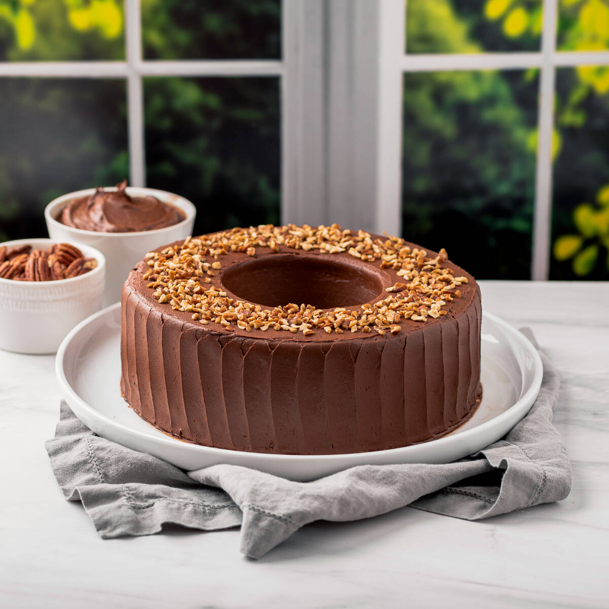 Exquisita rosca de pan sabor vainilla, cubierta con betún de chocolate y decorada con trocitos de nuez. Grande (Rinde de 15 a 18 rebanadas).