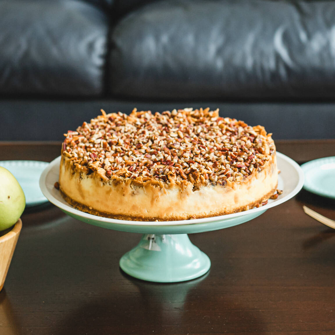 Pay de queso crema horneado sobre una base de galleta molida, cubierto con finas rebanadas de manzana, trocitos de nuez y un toque de canela. (Rinde de 15 a 18 rebanadas).