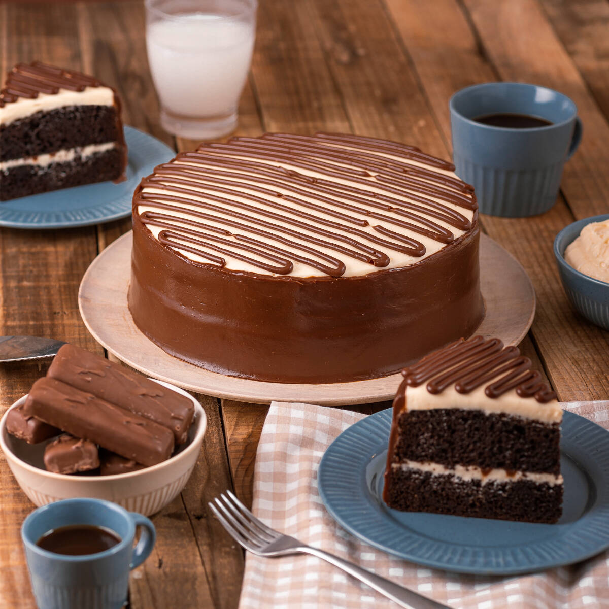 Pan de chocolate cubierto con queso crema, envuelto y decorado con el sabor original del chocolate Milky Way. Grande (Rinde de 12 a 15 rebanadas).