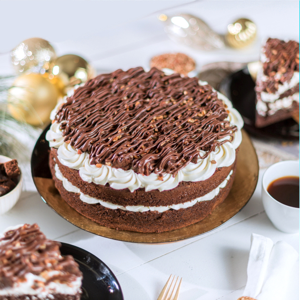 Exquisito pan de chocolate dividido en dos capas, cubiertas de betún queso crema con trocitos de brownie, líneas de chocolate y nuez. Mediano (Rinde de 12 a 15 rebanadas)