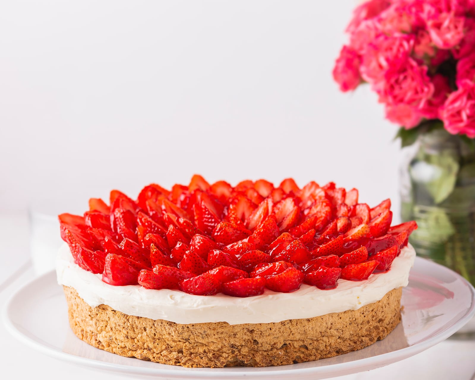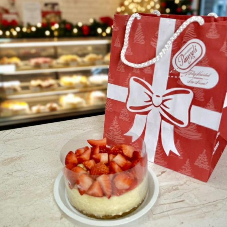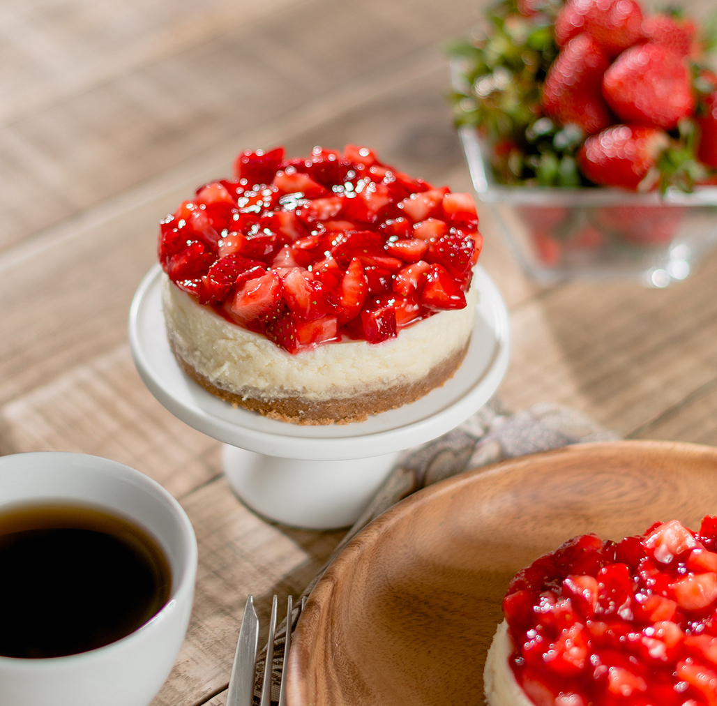 Exquisito pay de queso, sobre una base de galleta molida, colmado de frescas fresas