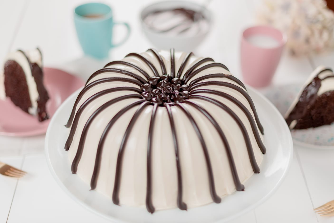Riquísima rosca de chocolate totalmente cubierto de betún queso crema y decorado con líneas de chocolate semi amargo. MEDIANO (Rinde de 12 a 15 rebanadas)