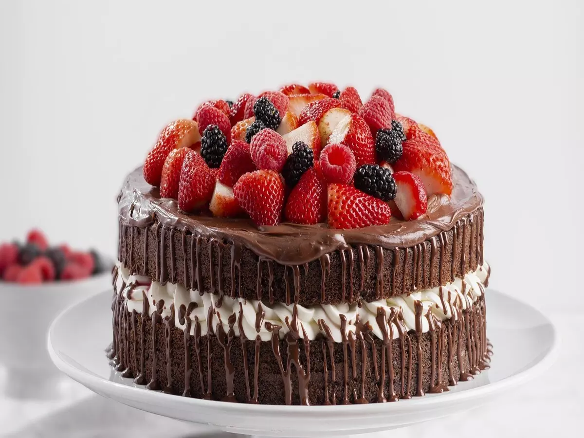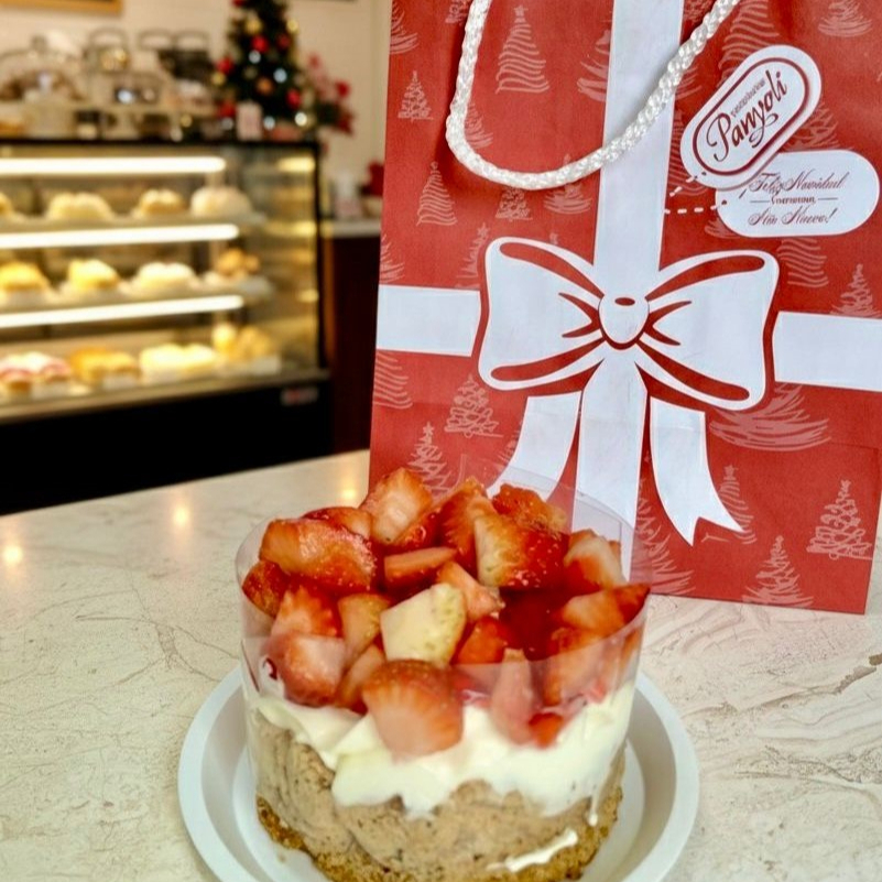 Riquísima combinación de merengue, galleta y nuez, cubierto con exquisito betún queso crema y fresas. GRANDE (Rinde de 15 a 18 rebanadas)