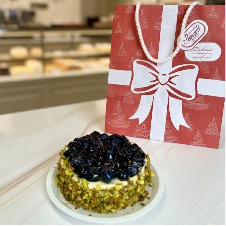 Espectacular queso crema sobre una base de galleta molida, cubierto de deliciosos blueberries frescos , decorado con pistache.