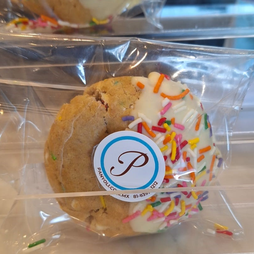 Galleta horneada sabor vainilla. decorada con glaseado y sprinkles de colores. con una textura suave por dentro y ligeramente crujiente por fuera.