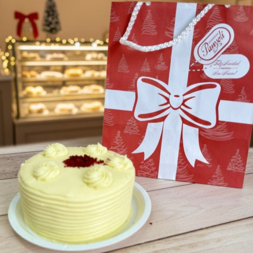 Delicioso pastel entres capas de pan color rojo obscuro con un toque de sabor a chocolate, cubierto de dulce betún especial de mantequilla con queso crema. relleno de betún con ralladura de chocolate blanco. mediano (rinde de 12 a 14 rebanadas).