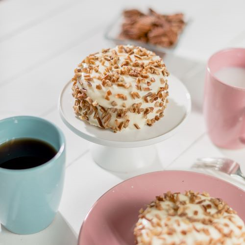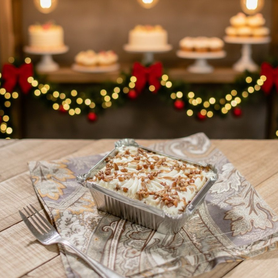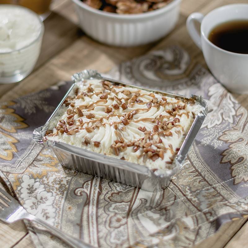 Pan vainilla humedecido en jarabe de tres leches, betún cremoso de queso crema, decorado con cajeta y nuez.