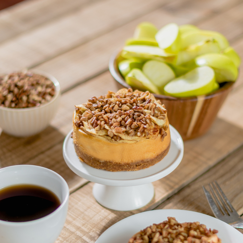 Pay de queso crema horneado sobre una base de galleta molida, cubierto con finas rebanadas de manzana, trocitos de nuez y un toque de canela. (Rinde de 15 a 18 rebanadas)