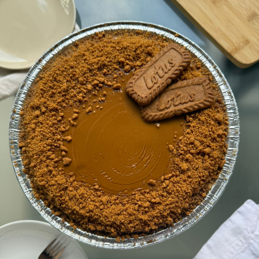 Pay de queso crema elaborado con la famosa Lotus Biscoff. Lleva una base de galleta horneada, relleno de suave queso sabor biscoff y decorado con crema y galletas de Lotus Biscoff. Puede rendir 12 rebanadas