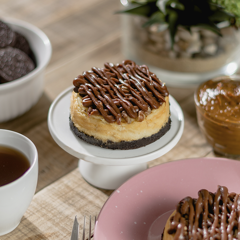 Exquisito pay de queso horneado sobre una base gruesa de brownie, decorado con rizos de chocolate y nuez sobre garnache de chocolate semi-amargo. (Rinde de 12 a 14 rebanadas)