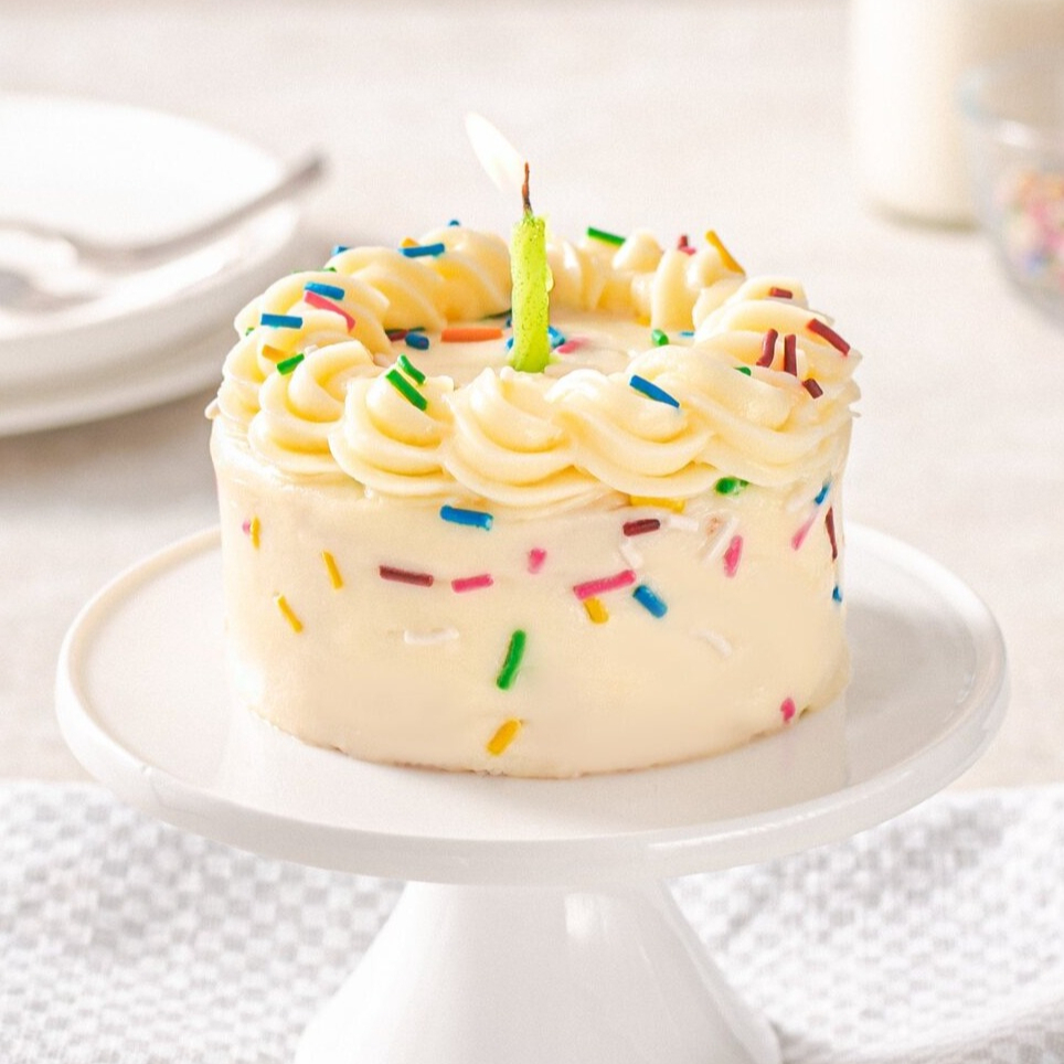 Divertido pastelito de vainilla, cubierto de betún de mantequilla y queso crema, con chispas de colores por dentro y por fuera