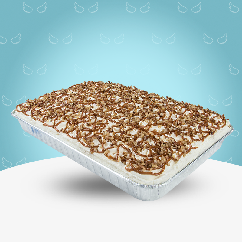 Pastel de vainilla, humedecido en jarabe de tres leches, betún cremoso de queso crema, decorado con cajeta y nuez. MEDIANO (Rinde de 12 a 14 rebanadas)